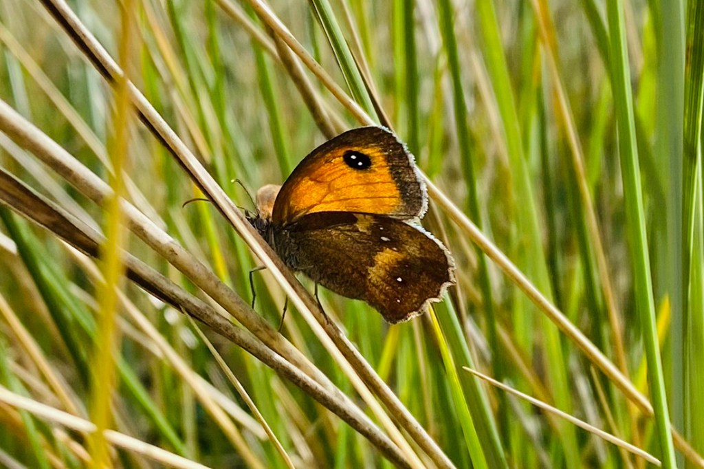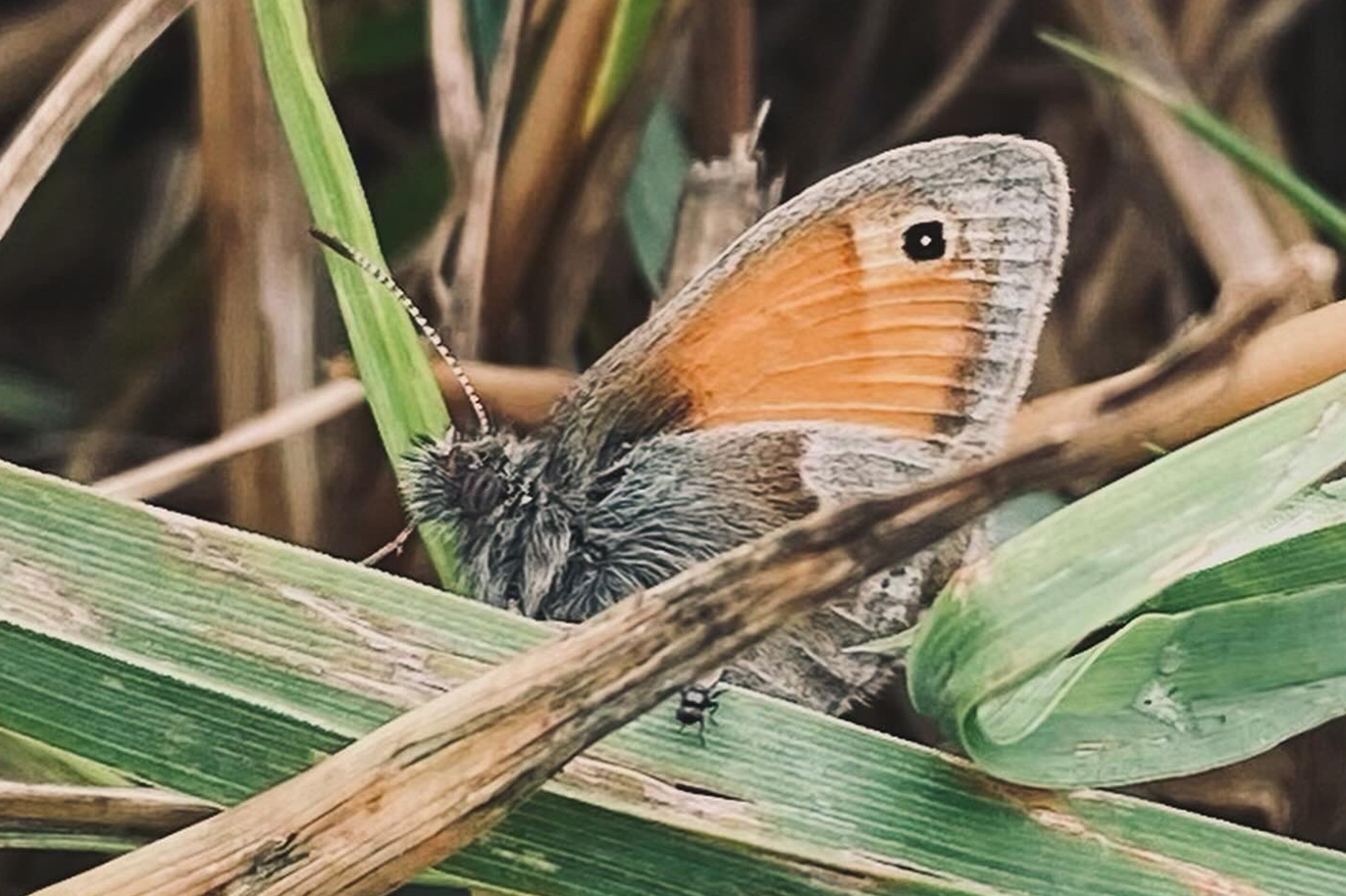 often seen flitting through long grass in meadows and woodland clearings. Its caterpillars feed on grasses, particularly fescues, and blend in well with their surroundings for protection.